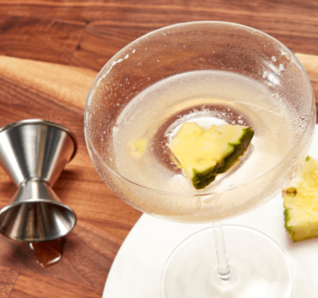 POUR bourbon, pineapple juice, Blanco Vermouth and bitters into a cocktail shaker and fill with ice
